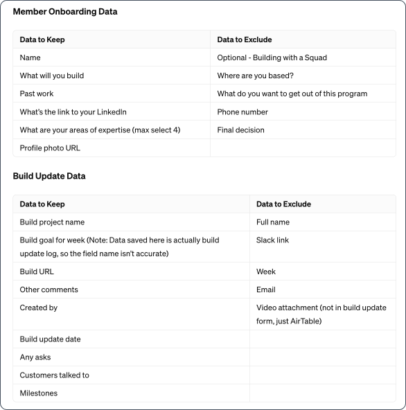Then I decided what data to keep and what to exclude. The data I excluded included confidential or sensitive data like phone numbers and emails, and anything not directly relevant to helping members discover and connect with each other.