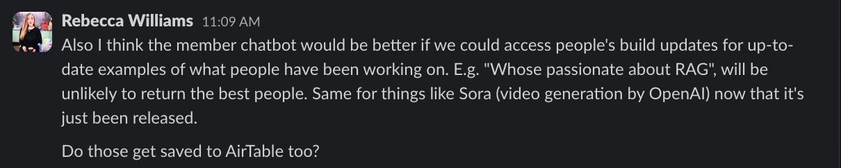 ✨ So the major value add AI had in this project was semantic search. The ability to retrieve members who most closely matched the intent of our search query, even if we only included one keyword like RAG, instead of Retrieval Augmented Generation.