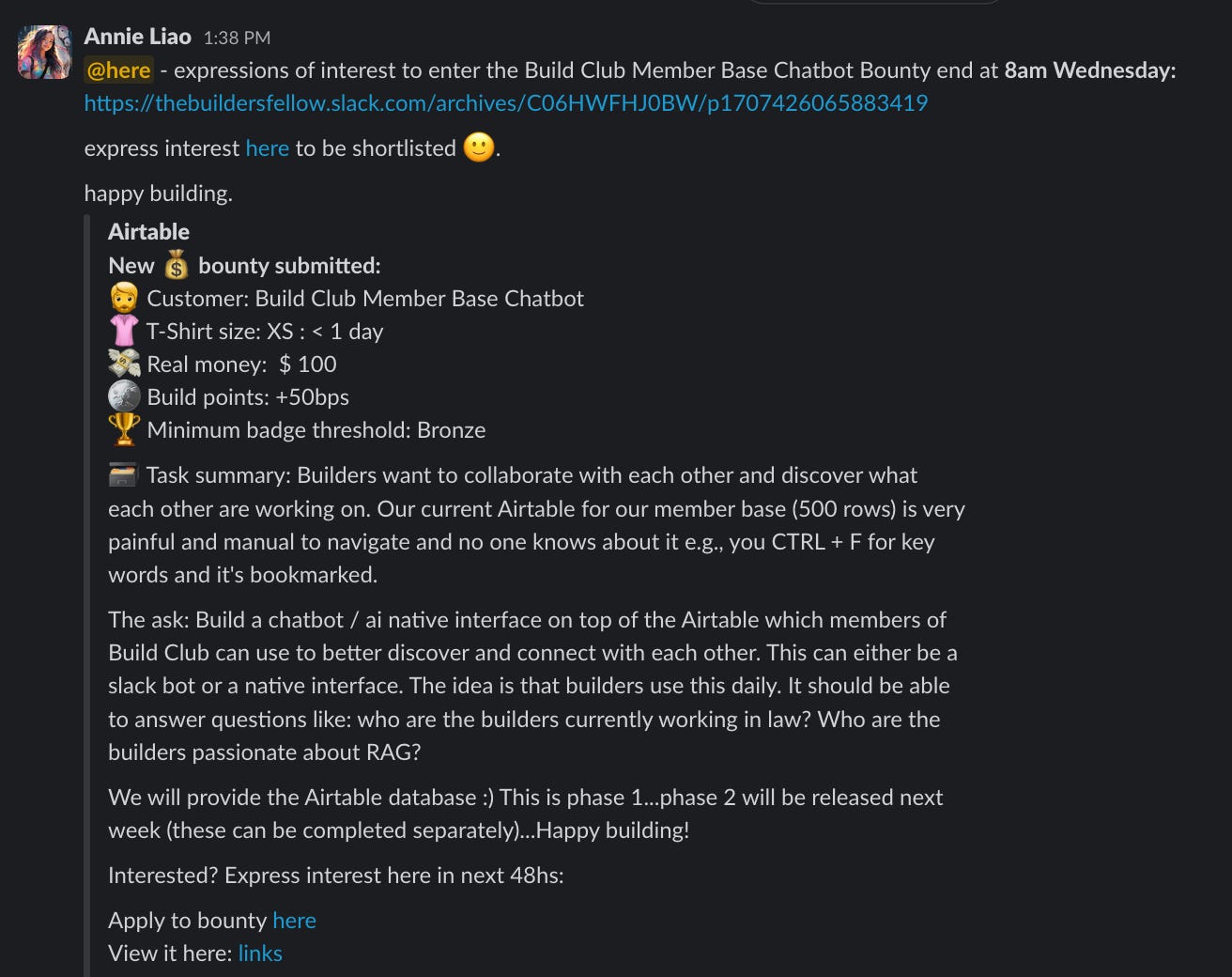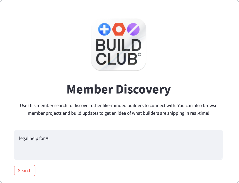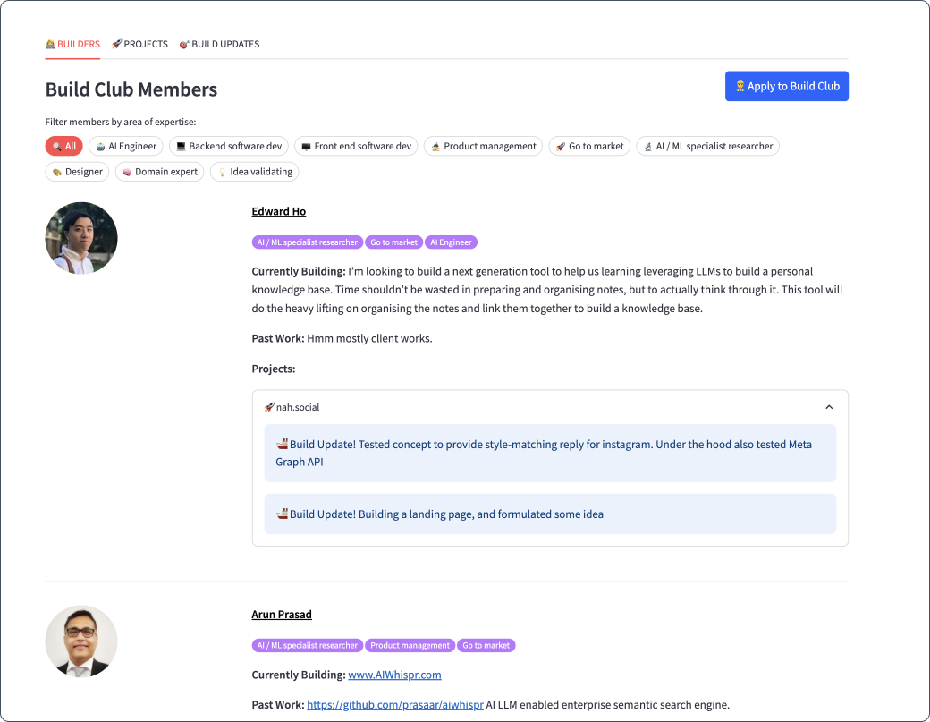 - Members can search for builders who have recently shipped updates related to a specific area or project. Many members who have gone through the onboarding process have not started projects or shipped updates within build club, so this increases the chances that you will be connected to a builder who is active right now.