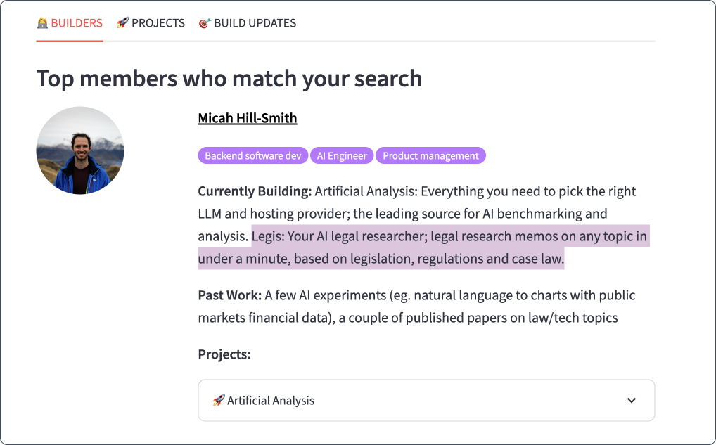 - Members can search for builders based on their onboarding data alone, who self-identified as an expert in a given area. If projects and build updates were included, that would be diluted.